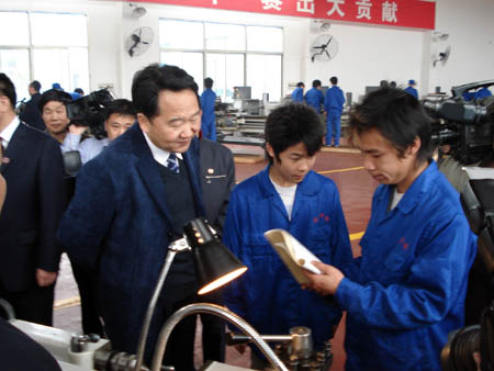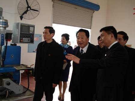 代表们乘车,沿着尚能路、知行路,饶有兴致地观看了我院的校容校貌,然后全体代表在樱花路下车,参观我院现代制造技术实训中心。车间里机器轰鸣,一派忙碌景象,学生们正在老师的指导下认真操作各种设备。此时在机加工车间实训的是我院继续教育部组织的劳务技能培训班的学员,他们全部来自我市贫困地区。当看到实训中心学生在实践操作时,蒋建国向前亲切地询问了他们的学习生活情况。胡卫平、刘演林向蒋建国、蔡力峰等介绍了我院立足娄底,服务湘中,为地方经济建设和社会发展培养技能性人才的做法。蒋建国边听边频频点头,并指出,我院能在这样短的时间内取得这样飞速的发展非常了不起。蔡力峰评价我院是娄底建设发展史上的一个亮点,并高度赞扬了我院为地方经济发展作出的突出贡献,他尤其称赞了党委书记胡卫平等我院领导班子团结务实,勤奋肯干,在短短几年时间内作出了一番大的成绩,足以载入史册。临别,刘演林院长向蒋建国送上了我院院徽作为留念,并向他解释院训“学以致用,自强不息”的含义,蒋建国高兴地接受了礼物。