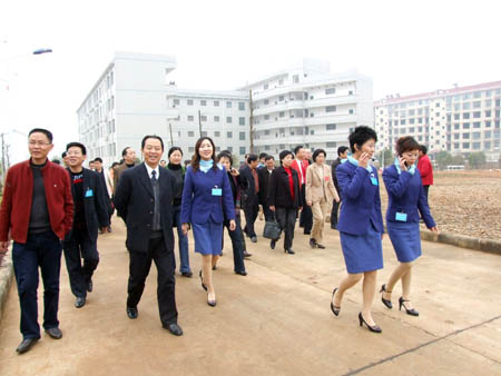 3月23日上午,娄底职业技术学院花团锦簇,春意盎然,广场喷泉翩翩起舞。9:40,参加全省精神文明创建工作表彰大会的160余位代表来到我院参观,其中包括省委常委、宣传部部长蒋建国,省委宣传部副部长、文明办主任罗志丹,市委书记蔡力峰,市委副书记姚正先,市委常委、宣传部部长童名让,副市长肖新桃、市委巡视员赵协卿等领导。院领导胡卫平、刘演林、彭建胜、周新元、宁小玲、颜彩飞、龙伟等陪同视察。