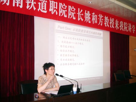 5月9日下午,湖南铁道职院院长姚和芳教授应邀来我院讲学。姚和芳教授系教育部人才培养工作水平评估专家,在她的带领下,湖南铁道职院于去年被评为首批国家级示范性职业院校。