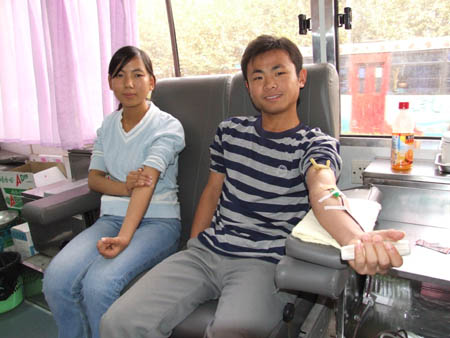 就在杨芳还在休息的时候,2名男孩子也上车要献血。经采访后,得知他们也是娄底职业技术学院农林工程牧医班大一的新生,笔者笑着对他们三位说:“你们3人不约而同在同一天献血,且都是同校新生,可真有缘分啊!”据了解,这2名男同学叫曾德清、向湖龙,曾德清在高二18岁期间就有献血的念头,他认为献血是一种公益活动,且有意身体健康。献血的时候,曾德清看到自己的血液缓缓从血管里流出时,说:“我看到自己的血啦,原来是暗红色的,原来以为都是鲜红色的呢?”采血护士向他解释,献血时抽取的是静脉血,静脉血因含氧少,二氧化碳多而呈暗红色,动脉血因含氧高而呈鲜红色。向湖龙经过体检合格之后,高声说:“我的血压正常,体检合格,可以献血啦!”采血的时候,他捋起袖子,对笔者说:“要来采访我啊!”引起周围人哈哈大笑。(作者:娄底市中心血站肖磊 原文刊发在《娄底广播电视报》07年11月7日A12版)