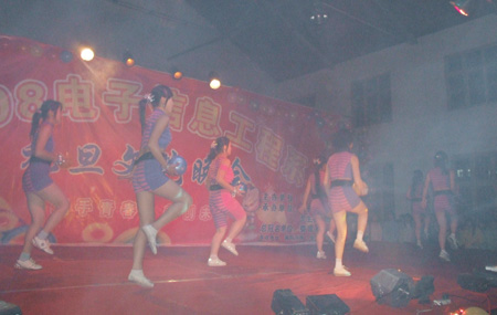 12月26日晚7:00,娄底职院室内篮球场歌声飞扬,舞姿曼妙,成为欢乐的海洋,由电子信息工程系主办的“2008年元旦文艺晚会”在这里隆重举行。出席此次晚会的领导有副院长龙伟、工会主席刘自斌、学工处处长刘罗仁、院团委书记杨惠梅、教务处处长易爱良、电子信息工程系主任吴连贵、系总支书记唐毅慈、副主任申东亮,电子信息工程全系系师生观看了演出。