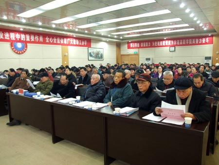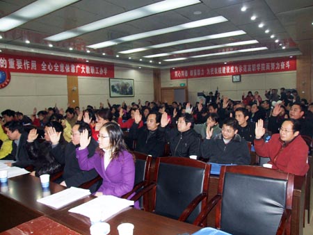 刘演林作题为《统一思想,凝聚人心,开拓创新,加快发展,为把我院建成省级示范性高等职业院校而努力奋斗》的工作报告,具体总结了学院2007年的工作情况:一是修订了学院发展的总体规划;二是机电工程学校整合进入我院的工作取得新进展;三是教育教学改革取得新成效;四是成人学历教育和职业培训工作取得新进展;五是科研工作取得新突破;六是加强了师资队伍建设;七是深化了内部管理体制改革;八是加强了招生就业工作;九是办学条件进一步改善;十是加强了党建和思想政治工作。刘演林从8个方面概括了2008年学院要做的主要工作:一是以省级示范性高等职业院校建设标准为依据,不断完善创建方案,切实明确学院各项工作的目标;二是以专业建设为龙头,不断完善符合技能性人才成长规律的培养模式,切实提高人才培养质量;三是以调整结构为重点,不断完善师资队伍建设机制,切实提高教师执教能力;四是以强化执行为重点,不断完善适应可持续发展要求的内部管理体制,提高管理水平;五是以优化育人环境为主旨,不断加强以弘扬职业文化为取向的校园文化建设,切实提高学院育人功能;六是就业为导向,不断完善招生、培养、就业一体化的人才培养机制,切实提高学生的职业素质;七是以改善实训条件为主体,不断改善办学条件,切实提高学院办学的基础能力;八是以服务社会为宗旨,不断加强技术服务平台建设,切实提高辐射能力。