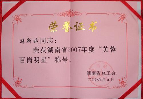 游新娥同志获湖南省总工会芙蓉百岗明星称号