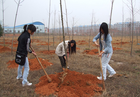 虽然天下着蒙蒙细雨,但参加植树活动的师生热情高涨,大家挥掀抡镢,干得热火朝天。挖坑、植苗、培土、浇水一点也不马虎。专业老师现场指导、验收、监督,一丝不苟。参加植树活动的师生每种好一棵树后,不仅为树浇上了一桶水,还细心地等水稍干后,给树培上土。一个下午的时间,百余棵小树苗被成功栽下,学院又将多一片幽静的绿荫地。参加植树的学生们纷纷表示:植树不仅增强了学生们的绿色意识和环保意识,还可以让学生切实感受到自己为创造美好校园生活做出了贡献,非常有意义。(文/杨正强 肖像 图/杨正强)