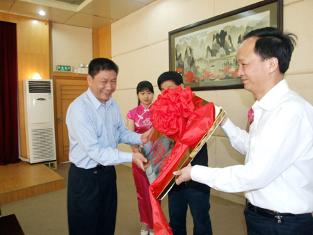 在热烈的掌声中,刘演林代表学院从赵协卿和邓建和手中接过了煤矿安全生产专业技术人才教育培训基地的牌匾。