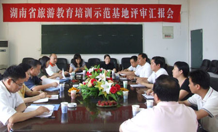 5月27日上午9时,湖南省旅游教育培训示范基地评审汇报会在我院实训楼207召开。省旅游局培训中心副主任高新国、省旅游局人教处副处长黄萍、市旅游局局长方建荣、市旅游局副局长刘冶键等专家领导及我院党委副书记彭建胜、院办公室、继续教育部、教务处、公共事务管理系、外语系的相关领导出席了汇报会。