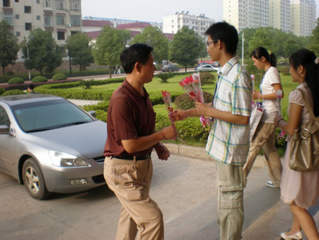 2008年9月10日是我国第24个教师节,为了庆祝这个节日,表达对全院教师的敬意,机电工程系十多位学生干部在系团总支书记徐志豪老师的带领下,一大早就聚在主教学楼、实训楼、科技楼前,向前来授课、工作的老师们献上鲜花,同时送上真诚的祝福。