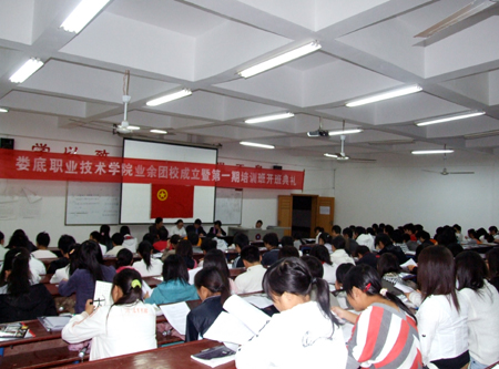 在开班典礼上,院党委委员、工会主席刘自斌要求我院共青团员要增强全面发展意识,增强紧迫感和责任感,高度重视自我素质的提升,努力学习,立志奋发成材。调研员欧阳雄作了《发挥团员先锋模范作用,树立共产主义崇高理想》的讲座,院团委书记杨惠梅宣读了《娄底职业技术学院业余团校章程》,并就共青团的基本知识作了详细介绍。
