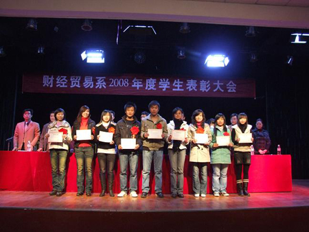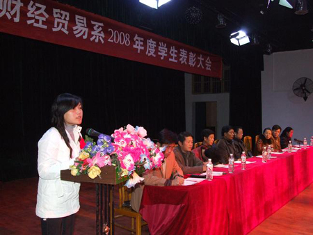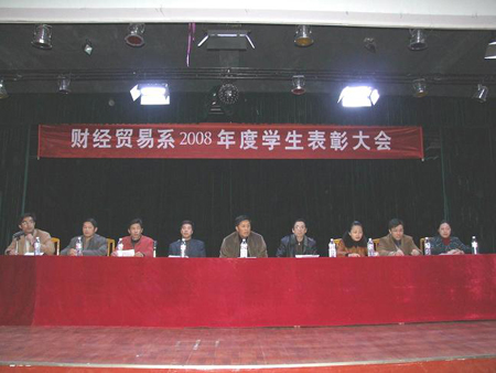 财经贸易系2008年度学生表彰大会于12月7日晚8点在南苑学生活动中心成功举行,全系师生1000余人参加。出席大会的领导有学院党委书记陈立楚、党委委员、副院长龙伟、党委委员、工会主席刘自斌、学工处处长刘罗仁、团委书记杨惠梅和财经贸易系主任周志和、总支书记朱岳坤、教学主任朱阳生、学工主任张一军及各专业带头人。
