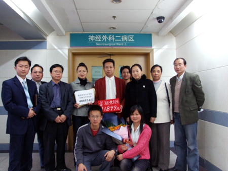 3月26日上午,因患脑瘤住院的唐浩同学在湘雅二医院进行第二次手术。唐浩生病住院的消息深深牵动着学院师生们的心。我院团委书记杨惠梅、工会副主席李翠兰、伍翼程、电信系主任吴莲贵、电信系学工主任申东亮、电信系分工会主席艾长春、唐浩班主任邓明亮及唐浩同班同学等师生代表一行3月26日清早出发,于中午赶到长沙。因为唐浩上午11点做完手术后,就直接送进了监护室,所以我们没能看到唐浩本人,下午两点将4万多元的爱心捐款送到了唐浩父母的手中。