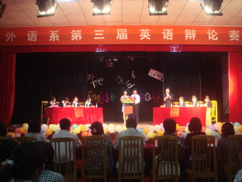 5月13日晚上7:30,由外语系举办的第三届英语辩论赛在学生活动中心隆重拉开序幕。外语系主任刘燕、副主任贺建良、邓海燕、外教Jim、Linda以及肖付良、苏燕飞、周萍等几位老师担任评委,全系400多名师生观看了比赛。