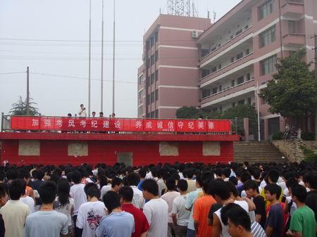 为了进一步规范考试行为、严格考试管理、创新考试制度、强化考试功能,按照“诚信考试、规范考试、创新考试、科学考试”的要求,全面加强机电系考风考纪建设,以考风考纪建设促进学风、教风的根本好转,机电系于6月11日早晨在田径场召开了全系“诚信迎考、杜绝舞弊”学生动员大会。