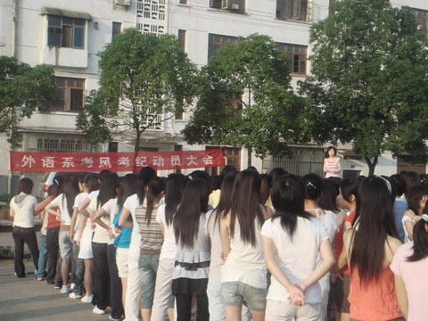 为进一步规范考试行为,严格考试管理,积极响应学院关于“加强考风考纪建设”的号召,6月18日早上6:40,外语系考风考纪动员大会在排球场召开。大会由教学副主任邓海燕主持,学工主任贺建良、学生干事陈秀丽、07、08级辅导员以及全系400多名学生参加。