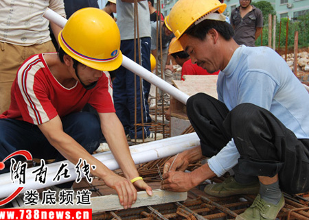 二十多个学生在工人师傅的指导下灵活地扎着钢筋、装配脚手架扣件……这是6月17日,记者在娄底市三星西街工程项目建筑施工工地上看到的一幕。