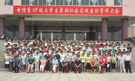 6月24日上午11点,电信系在校园文化广场主教学楼前组织召开了2009年暑期社会实践师生出征誓师大会。出席本次大会的有系主任吴莲贵、党总支书记唐毅慈、教学主任游新娥,还有参加暑期社会实践的300多名师生,大会由学工主任申东亮主持。