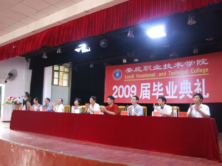 7月12日上午,娄底职业技术学院2009届毕业典礼在南苑礼堂隆重举行。院领导陈立楚、欧友佳、宁小玲、龙伟、周意坚、刘自斌、袁其谦、邹松建、曾国基出席。典礼由副院长刘自斌主持。礼堂内红旗飘扬,气氛庄重而温馨。