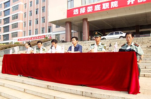 旭日东升,迷彩熠熠,9月6日,我院2009级大专新生军训动员大会隆重举行。副院长刘自斌、保卫处处长龙玉林、学工处处长刘罗仁、院团委书记杨惠梅及武警娄底支队相关领导出席,大会由龙玉林主持。刘自斌作军训动员报告,以“青年兴则国家兴,青年强则国家强”勉励09级新生,增强国防观念,掌握基本军事技能,将军训做为成才的重要开端。