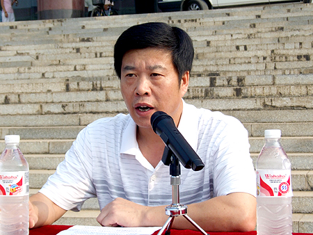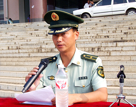 武警娄底支队教导大队大队长孙青柏发表讲话。他从“端正思想认识”、“树立吃苦意识”、“强化服从意识”及“配合教官工作”四个方面向新生们提出了建议和希望。新生代表周航在发言中回应,2009级新生一定不负众望,坚决以立志成才的激情、战胜困难的决心来面对入校后的第一个挑战,从而树立良好的新生形象,塑造崭新的精神面貌。