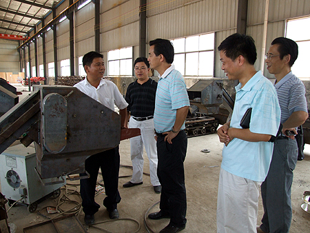 刚到小碧乡,就见一片片金黄的稻穗迎风飘扬,五六台收割机在稻田中忙碌穿梭,当地农民与收割机操作员顶着烈日汗流浃背地收割着水稻,一派热火朝天的工作景象。杜祥培、龙伟等院领导下到田间生产现场,亲自对收割机作业状况进行详细考察。考察中杜祥培、龙伟等对4LZ-0.8型收割机作业质量给予了高度评价,并对其工作效率赞不绝口。据了解,每逢收割季,往常农民们都采用手工收割,每人每天不足0.5亩,而启用新型收割机作业后,1小时就能收割两到三亩水稻。杜祥培不住感叹农机产业大有发展前途。整整一个上午,我院领导深入田间、工厂,对收割机的工作过程及生产现状进行了全面了解,并表现出浓厚兴趣。