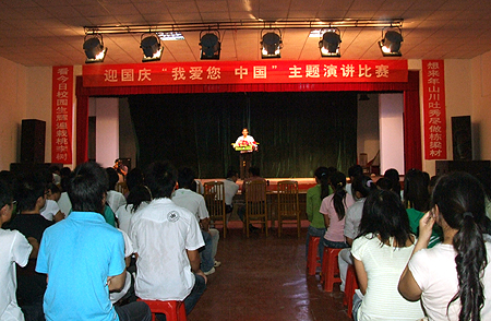 在庆祝建国六十周年之际,为深入贯彻落实党的十七大精神,大力弘扬中华民族先进文化,激发我院学生的爱国热情和民族自豪感,创建和谐文明校园,由思政课部、团委及宣传统战部主办的“我爱您中国”大型演讲比赛于9月24日晚在南苑礼堂隆重举行。