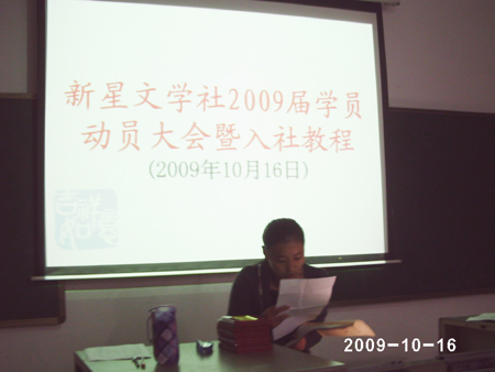 10月16号晚七点,新星文学社吸纳新成员后,于主教学楼208室召开本学年首次会员大会。