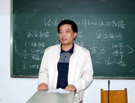 颁奖结束后,《娄底日报》编辑室主任肖思林为在座师生作了“谈谈对新闻工作的认识与感悟”的新闻知识讲座。他谈到了自己和新闻工作结缘的过程,学生在新闻单位实习需要注意的事项,以及新闻爱好者要成为新闻工作者需要具备的素质。他指出:作为新闻工作者,热情是最好的老师,有了热情才有激情,才能生出才情。一名优秀的新闻工作者必须具备文学素养、身体素质、政治素养、道德素养,之后才是专业水平的提高。他强调新闻工作者必须读好社会、生活、人生三本书,具有政治意识、阵地意识、大局意识。随后,听讲学生就自己对新闻理论和实践的困惑与其进行交流,他一一进行耐心的讲解。