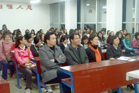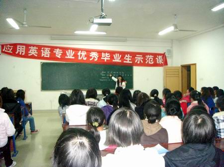 为给应用英语教育专业的学生树立良好的学习榜样和信心,使同学们尽早规划职业生涯,明确努力方向,11月23日晚,外语系邀请了现就职于小星星教育集团的05级三位优秀毕业生在主教学楼615教室上示范课。院长杜祥培、外语系主任刘燕、学工副主任贺建良、教学副主任邓海燕、学工干事及辅导员出席,09级应用英语教育专业的全体学生、07级和08级部分学生参与听课。