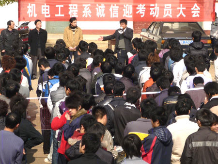 12月21日,机电系诚信迎考动员大会在科技楼前举行,系主任张海筹、系党总支书记刘跃华、教学副主任刘梅秋、实训副主任陈育新、学工副主任朱勇志、团总支书记徐志豪、09级各班辅导员及学生出席会议。大会由朱勇志主持。