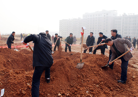 全体参加仪式的领导挥动铁锹,为中心奠基。