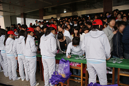 3月23日中午,主教学楼前异常热闹。两条8米长的绿色长幅摆在十几张长桌上,50余名身穿灰白色运动套装、头戴红色帽子的志愿者在桌后一字排开,热情地向下课后走出教室的学生们发放自制的资料,宣传低碳生活。同学们纷纷在印有“低碳引领环保、时尚、品质生活”、“低碳生活,从我做起”宣传标语的长幅上签名,还有同学在留言本上写下自己的感想:“低碳生活,呵护地球,很有意义”、“从小事做起,从身边做起,营造美好家园”等等。老师们也纷纷签名,表示对活动的支持。