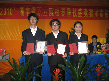 在赛场上,参赛选手个个精神抖擞,各施所长,纷纷亮出自己的绝活,向裁判们展现他们最精湛的技能和娴熟的技巧,充分展现了电信系学生良好的精神风貌以及熟练的专业技能,参加长沙民政职业技术学院计算机网络组建与安全维护的选手,在闭幕式上受到主裁判长中南林业科技大学陈宇拓教授的高度赞扬。经过四天三夜的激烈角逐,由刘益洪、曾东波、梁亮理、罗继军等老师指导的两组参赛选手罗新释、龚啸、肖金光和封谟余、陈昌贵、朱登奎同学均获计算机网络组建与安全维护比赛项目的一等奖;李和平、谢完成老师指导的申琼良、张科军、曹晓锋同学获嵌入式产品开发项目的三等奖。