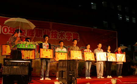 6日晚7点30分,由院团委、学工处举办的五四颁奖晚会在文化广场隆重开幕,表彰颁奖大会由党委副书记欧友佳主持。副院长刘自斌宣读了09年度院长助学金、院先进班级、优秀学生干部、三好学生、五四红旗团支部、优秀团干、优秀团员、暑假三下乡先进团队、自强之星获得者名单,院领导杜祥培、龙伟、周意坚、刘自斌、袁其谦为获奖班级和个人颁奖。