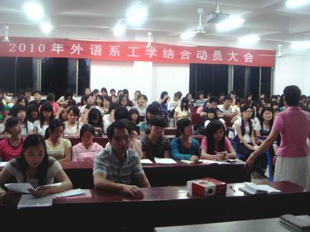 5月30日晚上7:00,外语系在主教学楼210室召开2010年工学结合动员大会。学工副主任贺建良、教学副主任邓海燕、团总支书记陈秀丽、辅导员谢杰及09级学生参加了会议。系主任刘燕作重要讲话。