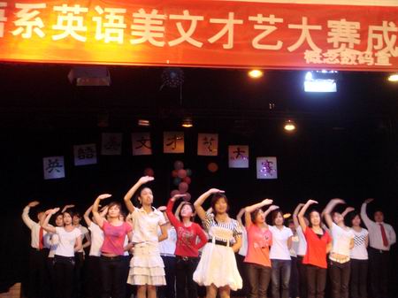 5月31日晚上7点,外语系英语美文才艺大赛在南苑礼堂隆重举行。担任此次大赛的评委有系主任刘燕、学工副主任贺建良、教学副主任邓海燕、教师周萍、周志军及外教Tony和Kirby。团总支书记陈秀丽、辅导员、外语系全体学生和口语协会所有成员参加。
