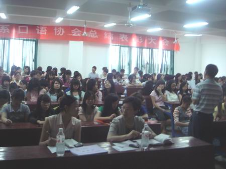 6月11日下午4:30,外语系在主教学楼510室举行口语协会表彰大会,出席大会的有系主任刘燕、团总支书记陈秀丽、辅导员谢杰。口语协会全体成员参加了此次会议。大会由系学工副主任贺建良主持。