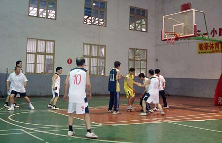 6月12日下午5点半,院领导篮球队与娄底三星集团干部篮球队的友谊赛在风雨操场开哨。院领导杜祥培、刘自斌、袁其谦、邹松建、曾国基、李天仁身着整齐的蓝白色球服,轮换上场与三星集团篮球队展开“厮杀”。