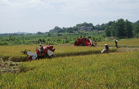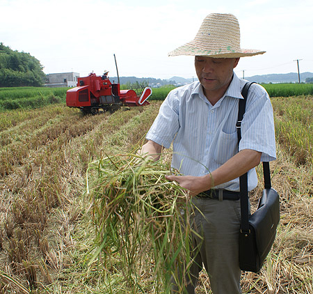 7月20日上午,我院新农村建设综合实验基地――娄底经济开发区中阳村迎来了两位特殊的“客人”――我院产学研合作实体湘丰娄职农业装备有限公司研制、拥有自主知识产权的4LZ-1.4和4LZ-1.0联合收割机。中阳村早稻刚刚成熟,只见稻田里金黄色沉甸甸的稻穗还衬着青色的稻叶,两台大红色的收割机自如地转身、收割、脱粒、扬草,短短半小时,就将1.5亩稻田收割完毕。稻田的主人曹姓村民将直接从斗仓中放下的稻粒挑回自家房前的坪中,开始铺晒。他很高兴地说:“机器真是好用。以前一亩田我们一家六口壮劳力要收一天,非常辛苦。这个收割机割稻和拌芜同时完成,而且脱粒均匀,很干净,晒好后可以直接收仓。”