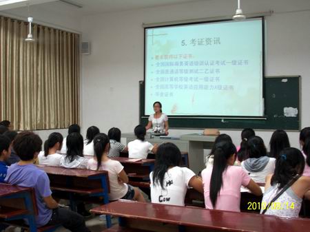 9月14日晚7点,外语系10级新生专业教育讲座在主教学楼118教室举行。参加讲座的有教学主任邓海燕、教研室主任肖付良和周志军、辅导员及10级新生。