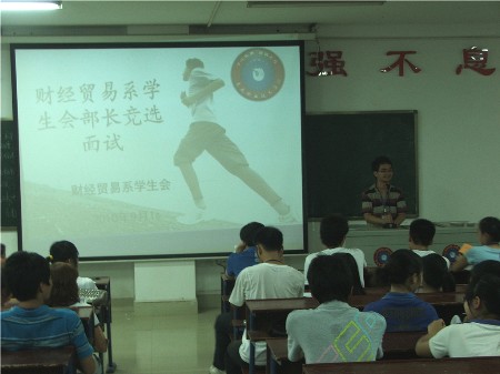 9月16日晚7点整,财经贸易系第八届学生会委员会换届选举在主教学楼610室正式拉开帷幕。与会的评委有财经贸易系学工主任张一军、学工干事李文艳和全体08级委员会成员。