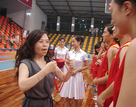 9月18日晚,在女篮成人组颁奖仪式上,湖南省体育局领导为我院女篮队员颁发了金牌和荣誉证书。(文/欧阳琦 图/刘寿松)