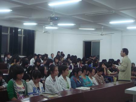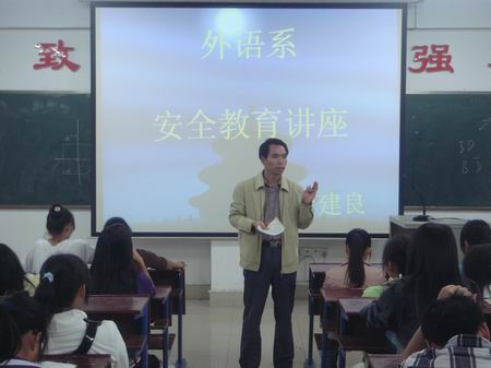 10月17日晚7点,在主教学楼310教室,外语系学工主任贺建良给2010级新生作安全教育讲座。