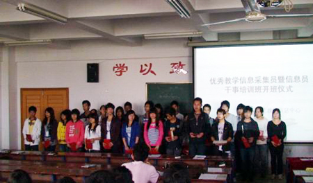会上,肖宏华副处长宣读了教务处对36位09-10年度优秀学信息采集员进行表彰的决定。教研科李宇才科长就教学信息员工作做指导发言,强调教学信息员工作要具备的六性:执行性、建议性、客观性、及时性、保密性、协调性,学生干部应该“干一行,爱一行”,要踏踏实实的做任何一件事,把实干精神放在第一位。教学信息中心主任唐湘辉作09-10年度工作报告。信息中心统计部部长田友顺作上学期教师教学工作量统计工作总结。信息中心督察部张秋凤同学带领全体信息员认真学习教学信息中心的工作制度与条例。 会上,教务处杨敏求、易毅等两位老师还对新入选的信息员和新生班学习委员进行了有关业务培训。(唐湘辉)