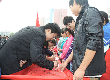 仪式上,近百余名学生代表依次在横幅上签名,表明对此次活动的支持。