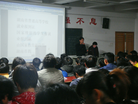 为了让我系毕业生掌握和了解就业网的使用方法,及时了解就业信息,做好就业准备,11月22日晚,机电系邀请招生就业处郭平老师和邓明亮老师在主教楼110和210教室就如何使用“就业网”举办讲座,该系08级的全体学生参加了此次讲座。