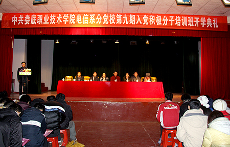 12月15日,中共娄底职院电信系分党校第九期培训班在南苑礼堂举行开班典礼。党委副书记欧友佳,组织人事处处长李新红,电信系主任吴连贵、分党校校长兼党总支书记唐毅慈、学生党支部书记申东亮、党总支组织委员胡楠,建艺系党支部书记李清奇、学生党支部书记曾素纯出席。典礼由申东亮主持。