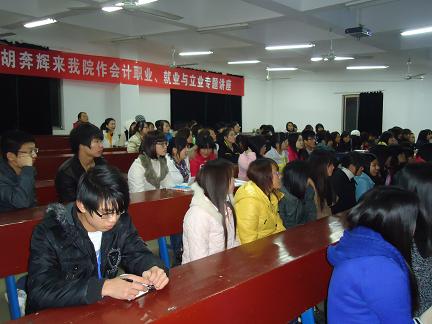 12月16日晚,由财贸系主办,会计教研室和卓耳会计协会承办的 “会计职业、就业、立业专题讲座” 在主教学楼410教室隆重举行。参加听讲座的是08级会计专业的毕业班学生。