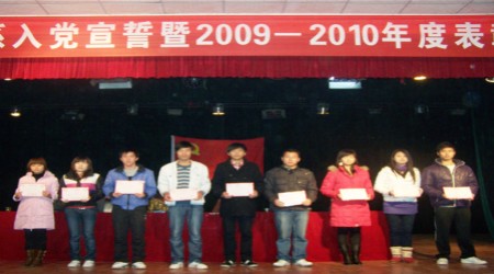 大会在激昂的国际歌中拉开序幕,随后教学副主任罗平良宣读预备党员名单,在鲜红的党旗下,预备党员们在学生党支部书记罗华带领下庄严宣誓。紧接着进行了表彰先进颁奖仪式, 大会表彰了系部优秀学生党员、08级优秀实习生、公管系自强之星、公管系大学生职业生涯规划大赛获奖学生、文明寝室等十多项获奖同学和集体,颁发了荣誉证书和奖金。