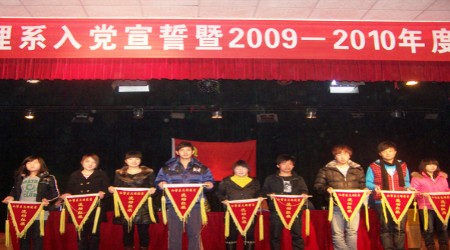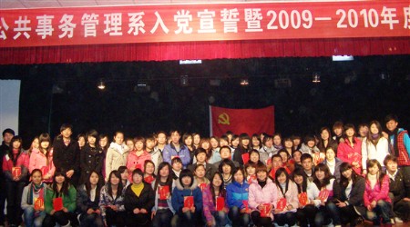 12月19日晚7点30分,公共事务管理系在南院礼堂隆重举行了入党宣誓暨2009-2010年度表彰大会。公管系系主任雷晚蓉、教学副主任罗平良、学生党支部书记罗华、学生管理干事施国以及各年级辅导员出席了本次大会,大会由学生管理干事施国主持。