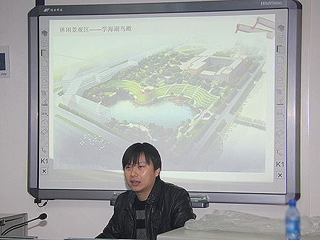 三家投标单位按序演示了自己的设计方案。湖南省园林建设有限公司“校园与观赏植物园合一,景观展示与人文、艺术、科教、生态、保健功能并举”的设计理念,“教学行政区、科研实训区、体育运动区、学生生活区、教师生活区”的功能分区,“校史广场、百家讲坛、励志广场、书山园”等主题园林广场设计,尤其是“学海湖”引入稻田的梯田景观设计令人叹服,得到大众评委的一致认可。