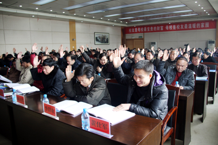 学院调研员李天仁向大会报告了校友会筹备工作。学院2010年3月成立校友会筹备委员会,在大半年的时间里遍访名校,汲取经验,走访校友,建立名册,在各地共建立了30个校友分会,覆盖了娄底、邵阳所有县市并辐射到了深圳等地。市民政局副局长刘琳宣读了市民政局关于批准成立娄底职业技术学院校友会的批复,全体与会人员举手表决通过了《娄底职院校友会章程》和第一届校友会理事会成员名单。第一届校友会由院党委书记陈立楚任顾问,院长杜祥培担任会长,院党委副书记欧友佳、调研员李天仁任常务副会长,下设正副秘书长各一名,常务理事19名,均为学院现任院领导或优秀校友代表。